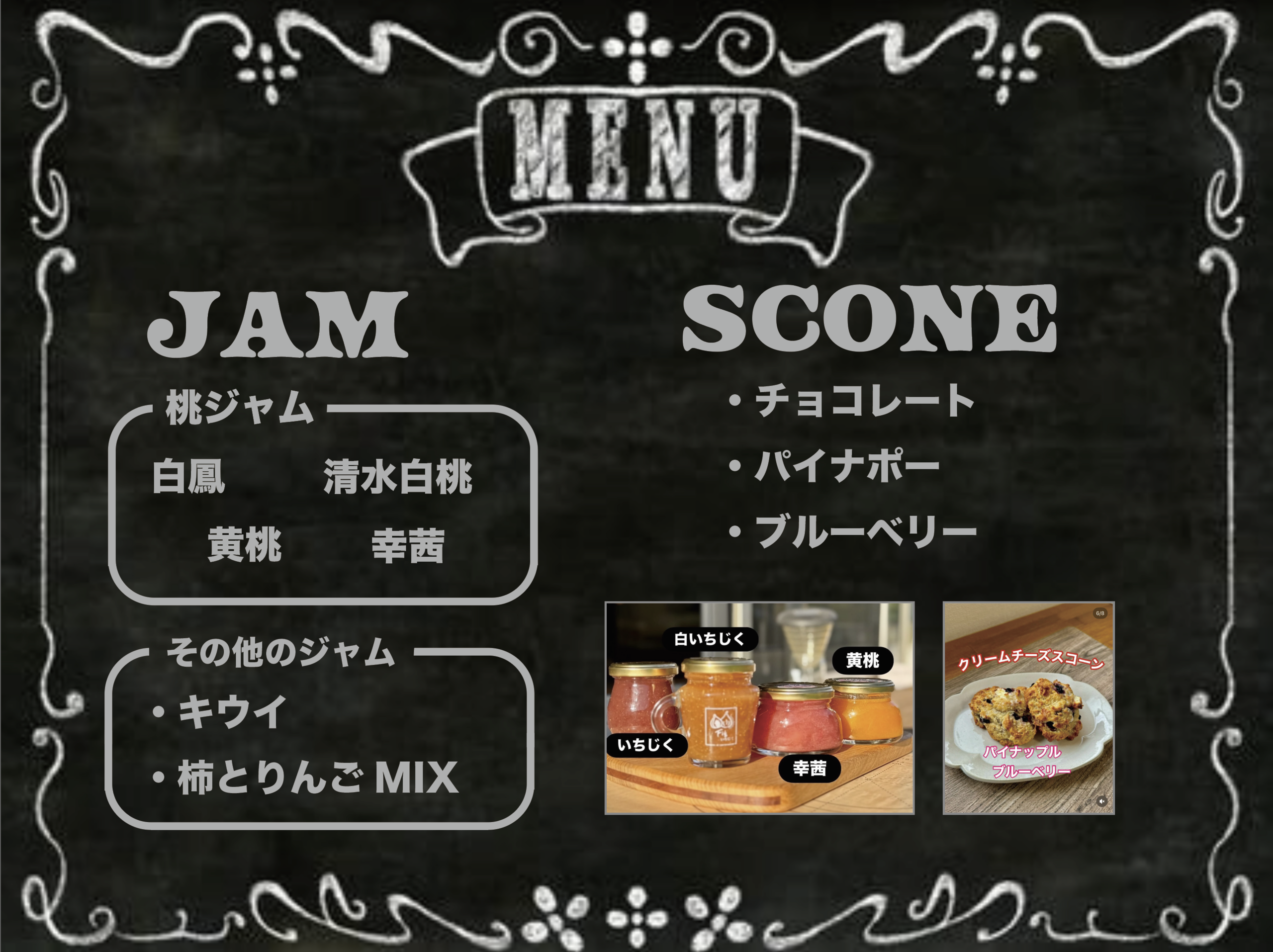 今回の出店にはうちの桃や数種のフルーツを使ったジャムとスコーンをご用意いたします。